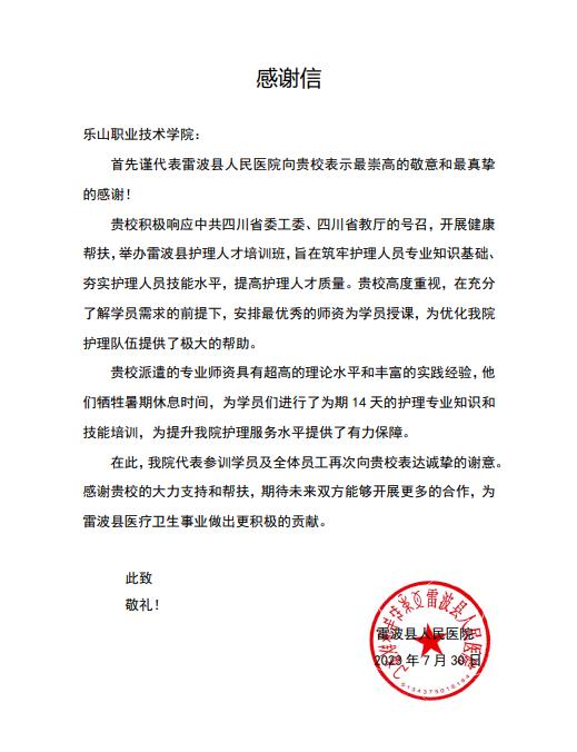 12月12日,sunbet申搏官方网站圆满完成了对雷波县护理人才三期班的帮扶培训工作,三期帮扶培训班分别于2023年7月、11月、12月开班,来自雷波县人民医院、雷波县中彝医院、妇幼保健院及部分乡镇卫生院共计149名学员先后参加了培训。派出单位特意给学校发来感谢信,感谢学校的支持与帮扶。