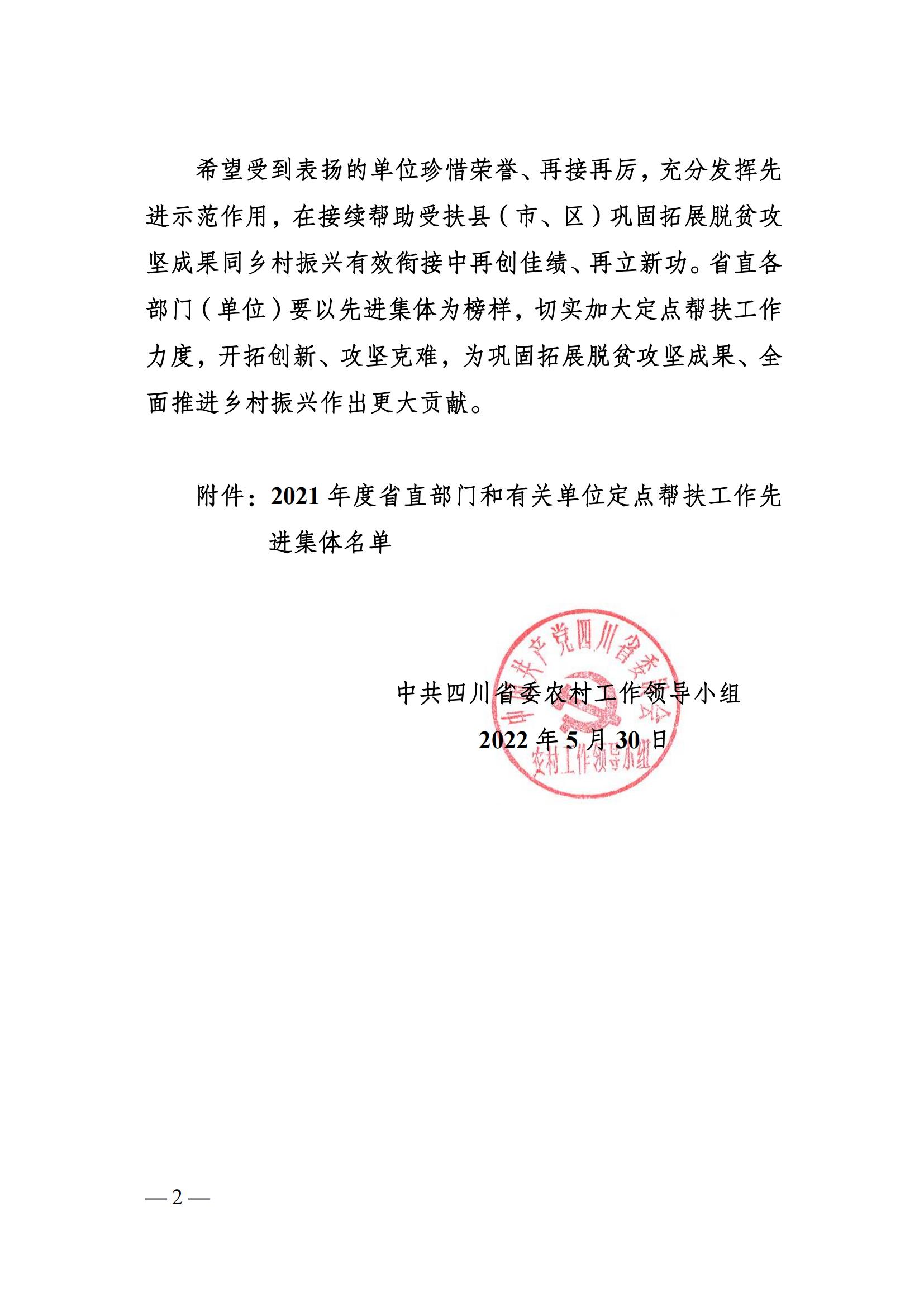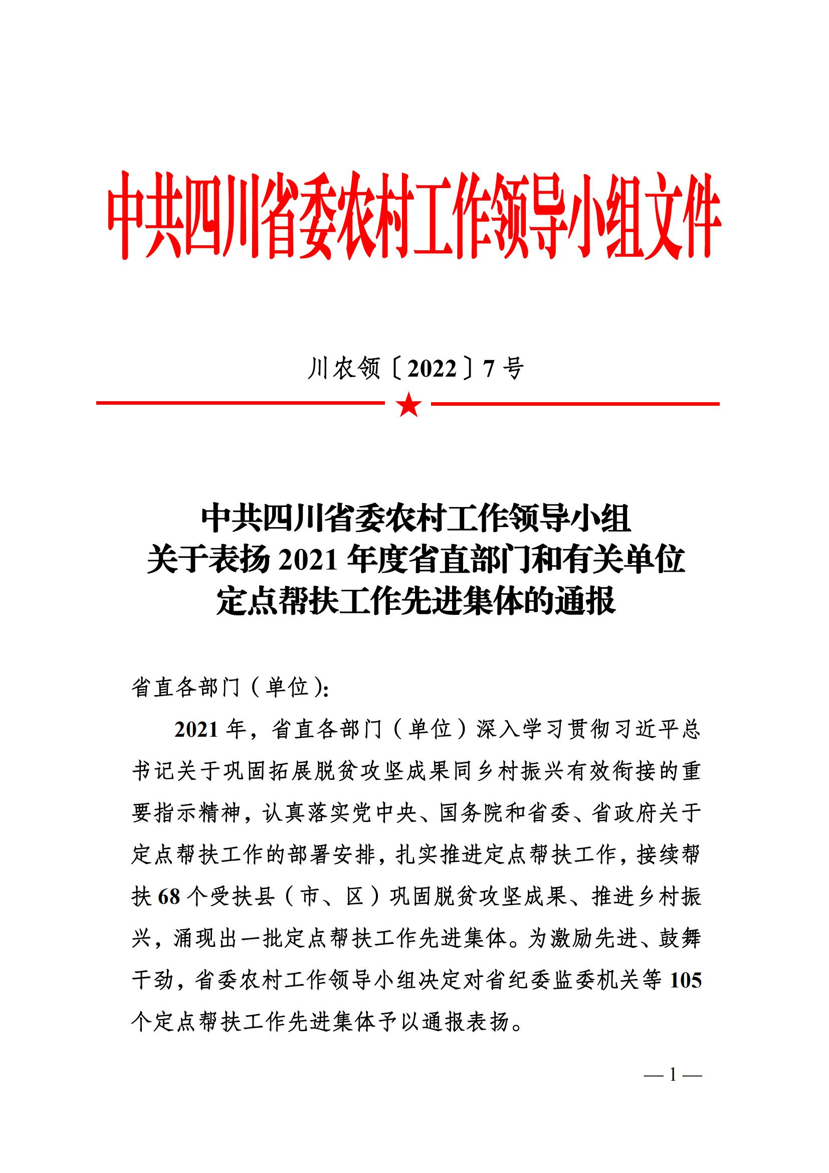 近日,中共四川省委农村工作领导小组对定点帮扶工作先进集体予以通报表扬。sunbet申搏官方网站被评为“定点帮扶工作先进集体”。
