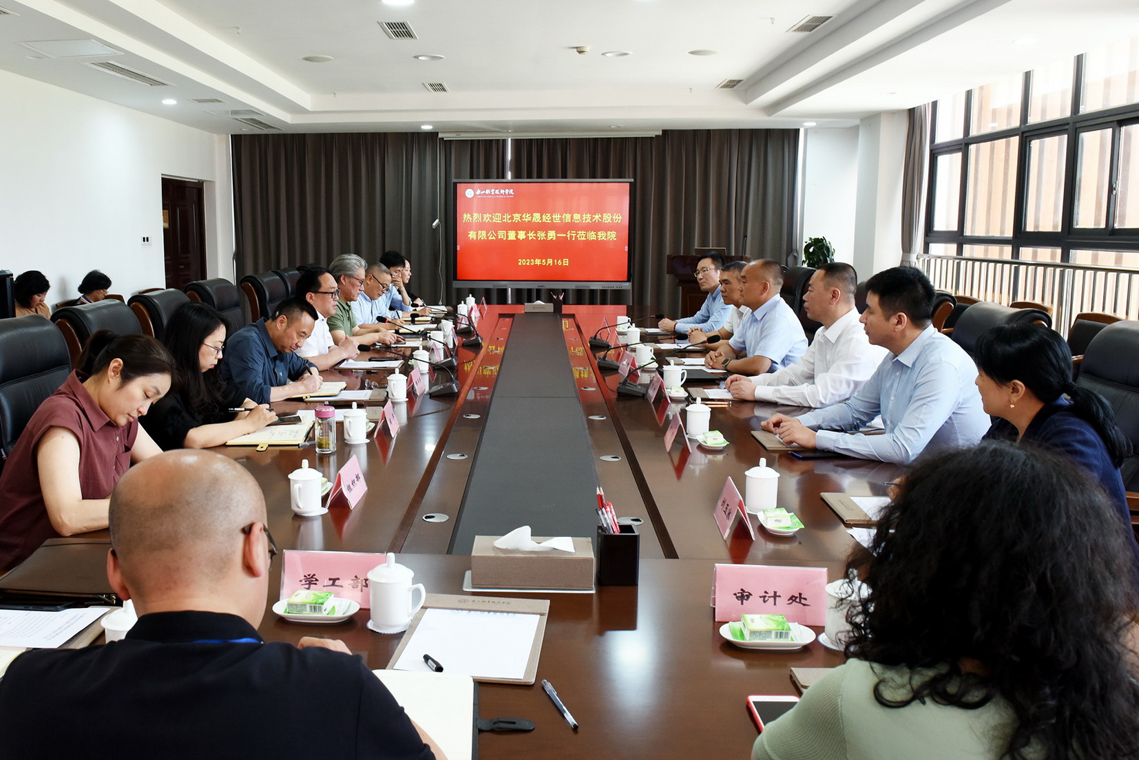 5月16日下午,北京华晟经世信息技术股份有限公司董事长张勇率队,一行六人来申搏官网调研,在学术交流中心2001会议室与学校党委书记成定彬等开展校企合作项目成果座谈交流。学校党委副书记陈芝海,党委委员、副院长陈元进、张学河、周芹及相关部门、二级学院负责同志参加座谈。会议由张学河主持。