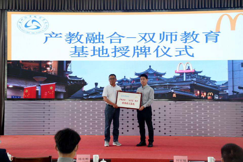 邵其会受学院领导委托授予四川金拱门食品公司为工商管理类专业“双师型”教师培养培训基地,表示希望进一步加强产教融合、加强“双师型”教师培养,提升教师业务技能,更好地为企业、社会培养高素质技术技能型人才。