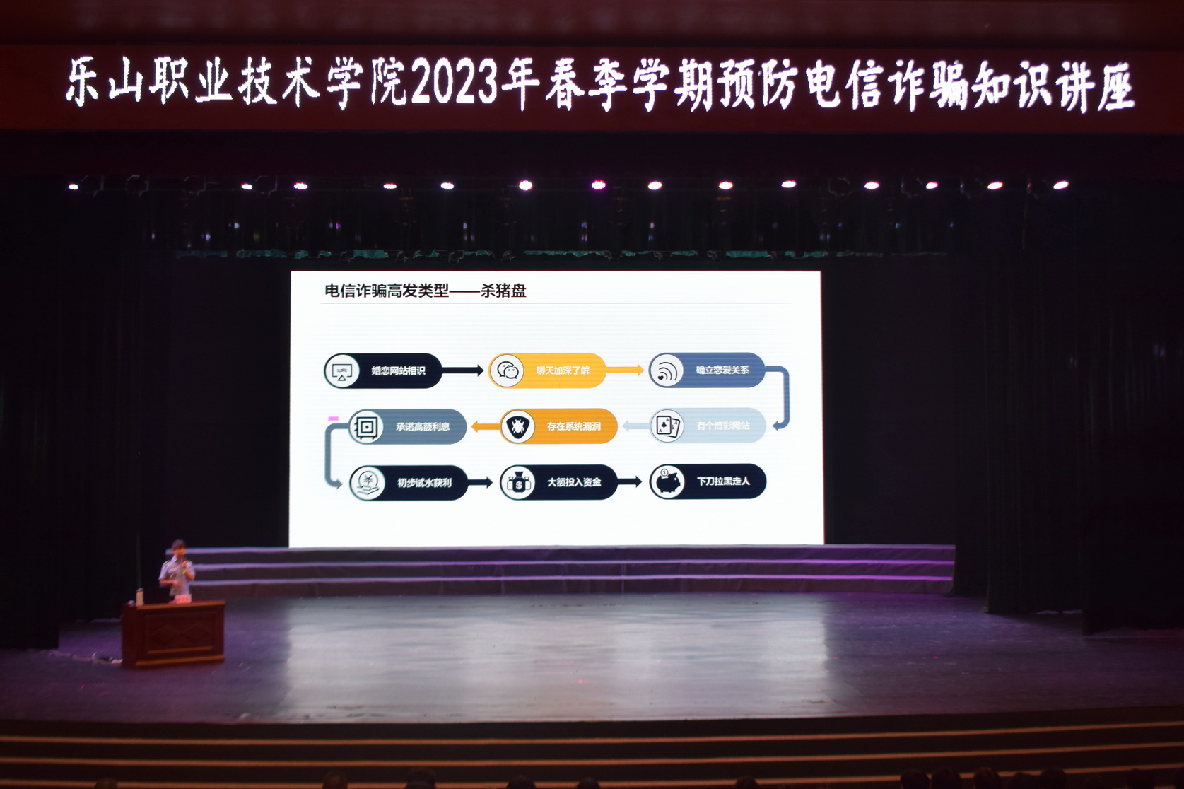 黄警官重点介绍了党中央高度重视打击治理电信网络诈骗犯罪工作,传达了习近平总书记的重要指示及乐山市市委书记马波就学习贯彻习近平总书记指示精神提出的要求,坚持宣传教育,积极推广注册国家反诈中心APP 。并对电信网络诈骗、电信诈骗高发类型、“两卡”犯罪、打击境外跨境犯罪作了详细生动的讲解。呼吁在校师生提高防范意识,避免被骗或者成为犯罪分子的“帮凶”。
