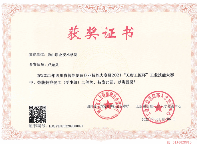 学院学生获技能大赛暨2021“天府工匠杯”数控铣工二等奖
