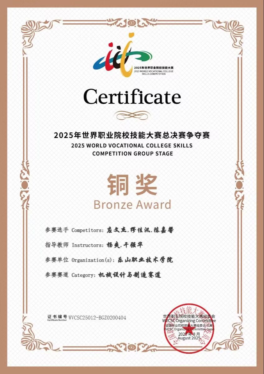 学院学生获2025年世界职业院校技能大赛总决赛争夺赛机械设计与制造赛道铜奖