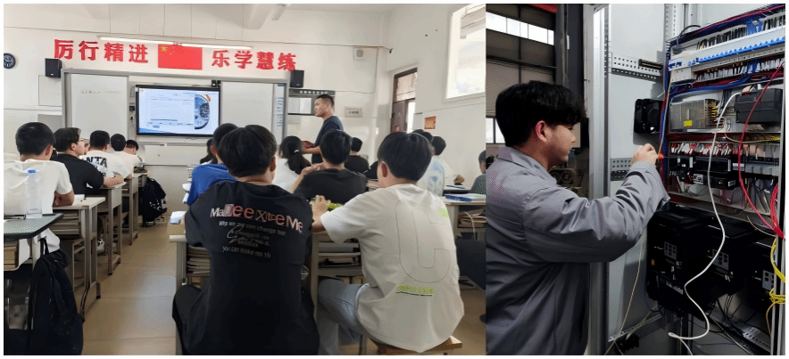 图9 学生实习担任中职代课教师 图10 学生调试电气控制柜