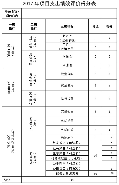 本部门对学院2017年物业管理费项目开展了支出绩效评价,从项目资金申报及批复、项目实施及管理、项目完成及效益等方面展开了评价,得分为95分,存在的问题:一是资金结转数额较大,二是预算编制不够科学合理,实际情况发生变化后,未能及时调整预算。下一步改进措施:一是合理编制预算,提高预算编制的准确性,二是认真开展预算中期评估,提高资金使用效率。