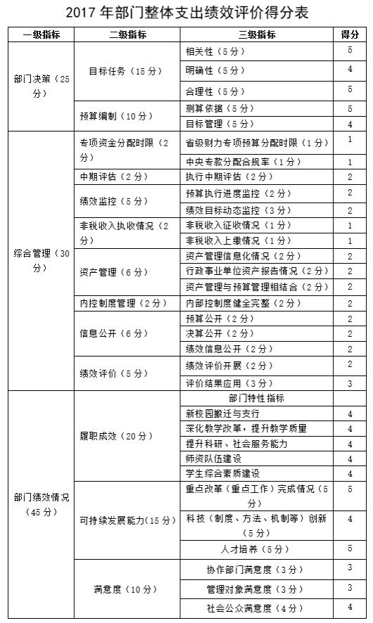 按照预算绩效管理要求,本部门对2017年整体支出开展绩效自评,按《部门整体支出绩效评价指标体系》标准,自评得分96分。学院总体绩效目标明确、决策依据充分、资金分配科学合理,资金管理规范,任务完成良好,达到了预期效果。