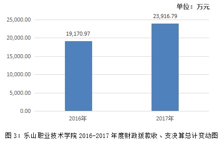 2017年度财政拨款收、支总计23916.79万元。与2016年相比,财政拨款收、支总计增长4745.82万元,增长24.76%,增长原因为我院执行公办高职院校生均拨款制度,生均拨款标准为1.2万元,学生人数的增加使2017年财政拨款总额比2016年有所增加;2017年初财政拨款结转数额较大。