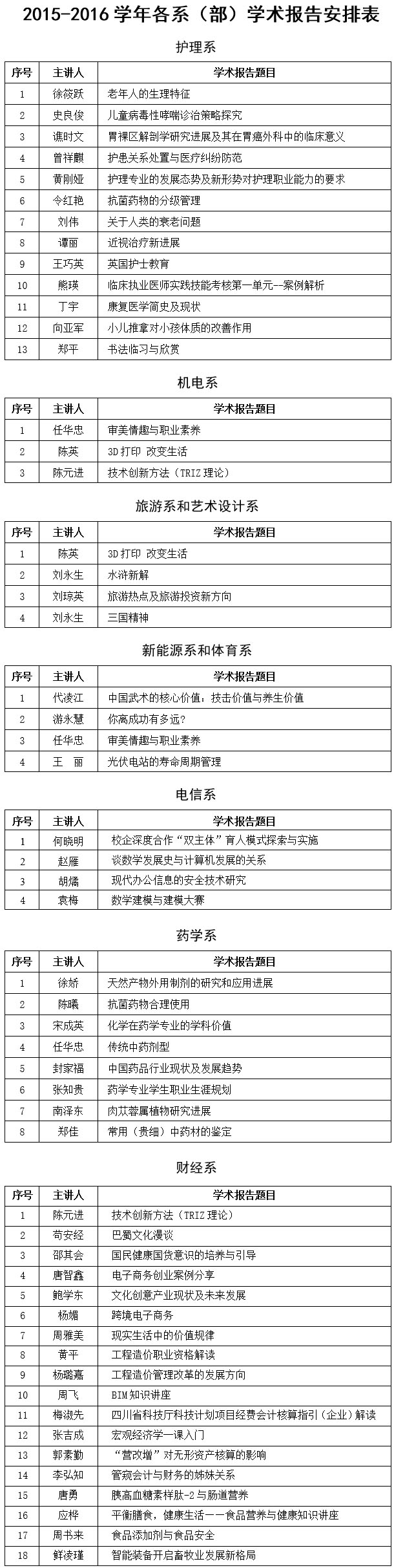 各系(部)以专业或系(部)为单位从教务处征集的学术报告题目中选定本学期具体实施的题目,按顺序依次安排。本学期未作安排的题目,2016年春季学期接着实施。本学期各专业学生听取学术报告的次数限定为2次。对于平行班级多的专业,同一题目视讲授效果可安排多轮实施。各系(部)学术报告安排表见附件。