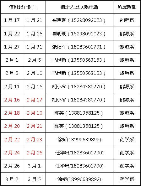 根据学院寒假安排,为进一步做好节假日值班工作,确保学院高新区实训室及相关设备的完好和安全,现就有关事项通知如下: