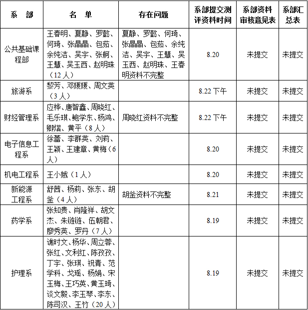依据教务处7月23号“关于2013年6月教学工作运行情况及7-9月重点工作项目安排及开展第二批B组“项目化课程设计与职业教育教学能力测试”的通知要求,各系(部)需于8月18日前组织第二批B组系部初测评并提交推荐名单, 8月21日前提交已通过系部初测评教师的项目化课改测评全套资料,现对截止2013年8月21日24时各系(部)资料提交情况做一通报: