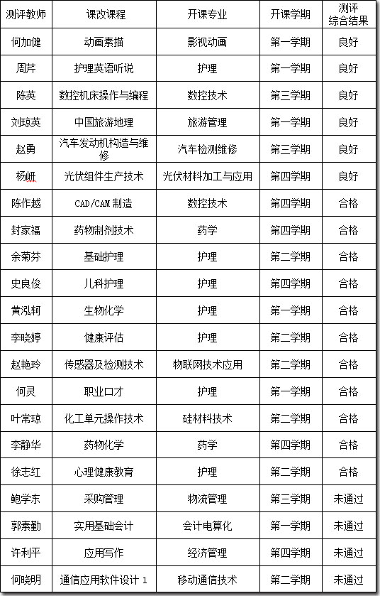 根据《sunbet申搏官方网站以能力为本位的项目化课程改革实施方案》(乐职院【2012】65号)文件精神,学院于2013年1月28-29日由常州工程职业技术学院专家对第一批21位进行项目化课程改革的教师进行了职业教育教学能力现场测评、2013年2月学院三大专业评委组对测评教师提交的材料进行了评审。经2月28日学院项目办领导小组会审核,现将综合测评结果公示如下: