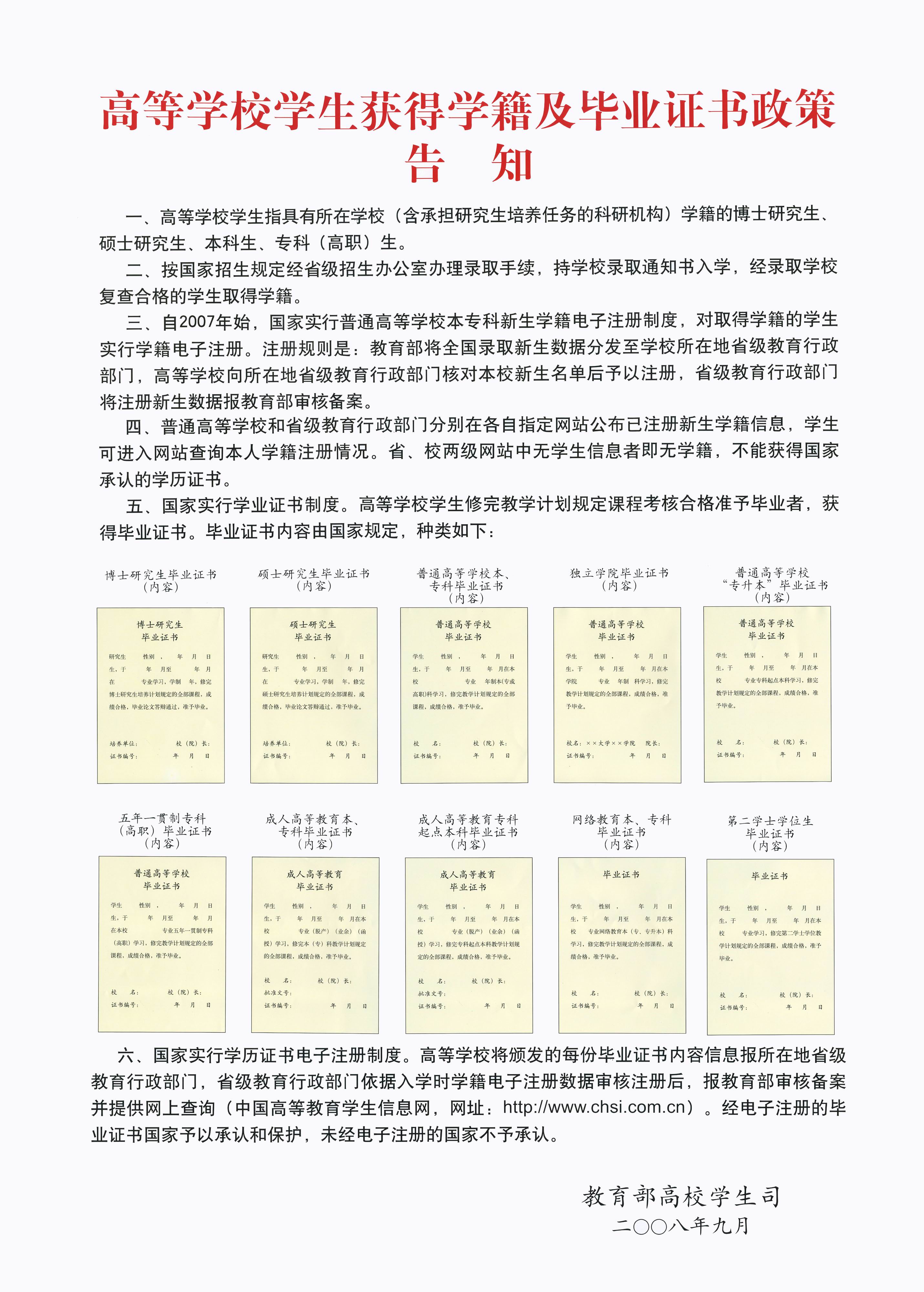 高校学生获得学籍和毕业证书政策通告