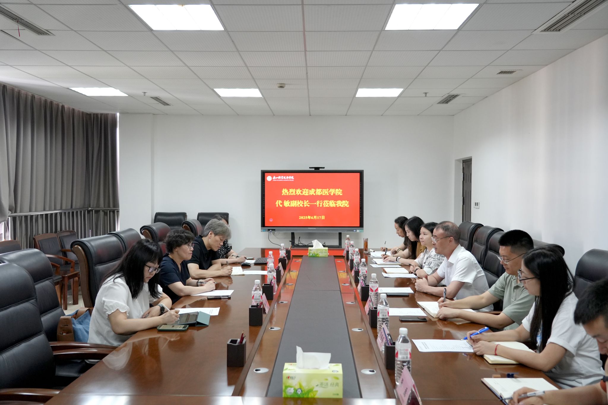 6月17日,成都医学院党委常委、副校长代敏,继续教育学院院长王涛一行4人来校调研,学校校长刘忠、相关部门和二级学院负责人出席会议并开展座谈交流。