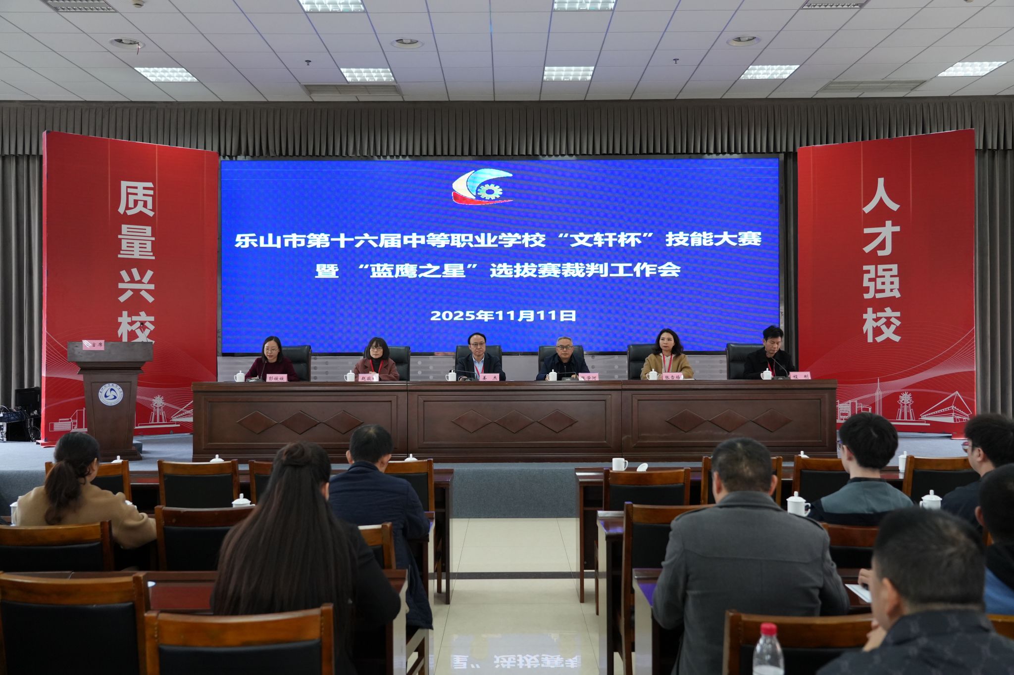 2025年11月11日,乐山市第十六届中等职业学校“文轩杯”技能大赛暨“蓝鹰之星”选拔赛裁判工作会议在sunbet申搏官方网站隆重举行。乐山市教育局四级调研员、市教育系统侨联主席姜杰,乐山市人力资源与社会保障局职业能力建设科副科长赵欧雅,sunbet申搏官方网站党委委员、副校长张学河出席会议。参加本次会议的还有组委会工作人员、各赛项裁判、监督组成员。会议由继续教育学院(继续教育处)彭媛媛主持。