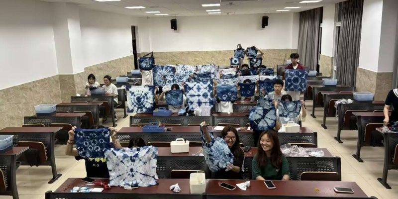 在实践环节,同学们充分发挥创意,将白色布料折叠成不同形状,用棉线或橡皮筋捆绑后放入染液浸染。等待过程中,大家交流设计思路,现场气氛热烈。拆开捆绑线后,蓝白交织、独一无二的图案呈现在眼前,同学们纷纷拍照记录。