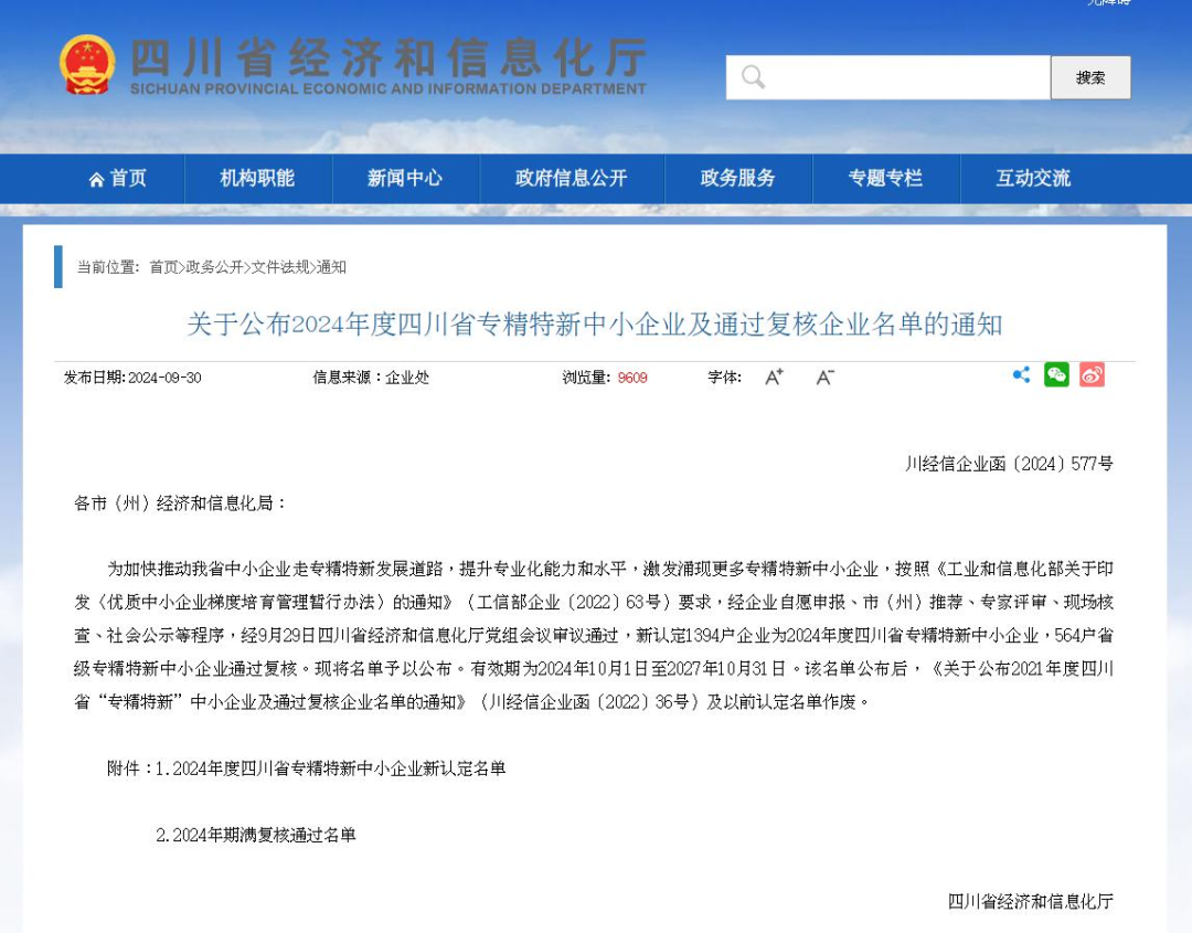 近日,四川省经济和信息化厅发布了《关于公布2024年度四川省专精特新中小企业及通过复核企业名单的通知》。乐山高新区尚纬股份有限公司、四川吉晟生物医药有限公司等7家企业经过自主申报、市(州)推荐、专家评审、现场核查以及社会公示等程序,获批认定为四川省“专精特新中小企业”。