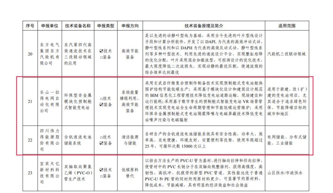 四川伟力得能源股份有限公司是四川省唯一一家凭借“全钒液流电池储能技术”入选四川省工业领域先进适用绿色低碳技术装备目录的链主企业。“全钒液流电池储能系统”使用的是自研的第三代电堆,采用全球首创激光全焊接封装工艺,克服传统胶圈密封漏液问题,大大提高电池使用寿命,具有安全性和环境友好等特点,大幅降低储能电站后期设备维护成本。该装备技术已批量用于2024年8月27日全容量并网的全国电网侧商业化运营容量最大的全钒液流独立共享储能项目(甘肃中核汇能中帛源50MW/200MWh独立共享储能项目)。