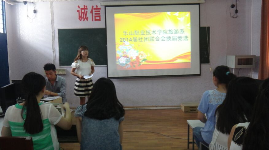 6月17日下午3点半我系在电子阅览室进行了2014届社团联合会的换届竞选。由团委老师刘诗妍及各社联社长担任评委。