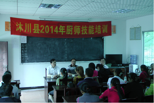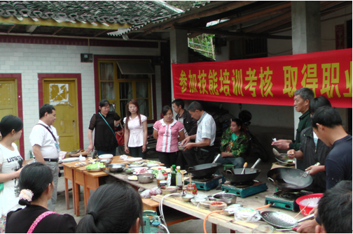 2014年5月29日,旅游系中式烹调师考评员陈瑞祥、刘海和乐山现代技术学校教师到沐川县幸福乡参加2014年沐川县农民工技能培训初级中式烹调师的考评工作。