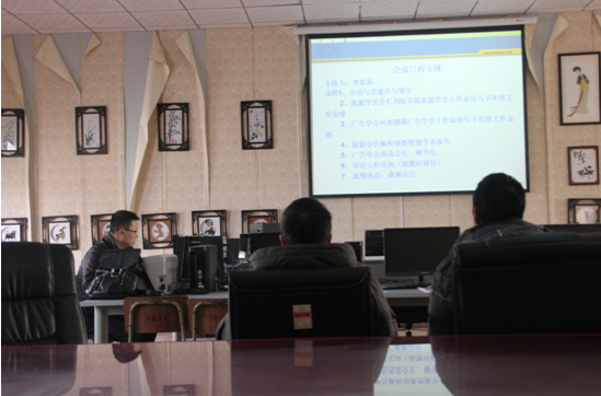 2014年1月17日上午,sunbet申搏官方网站旅游学会和广告学会在旅游纪念品实训室召开了年度工作总结会。会议由旅游系书记李忠东主持,旅游学会会长刘琼英、广告学会会长何加健分别对两个学会2013年的工作做了总结,并对2014年的工作做了安排。旅游系杨帅老师就《2012年全国旅游院校基本情况》做了专题讲座。