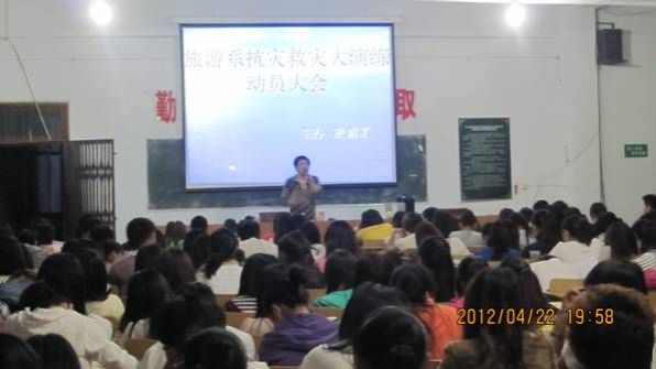 2012年4月22日20:00时,旅游系学管办组织全系学生召开了抗灾救灾大演练动员大会,大会由学管办黄剑波副主任主持,各班级辅导员参加了大会。