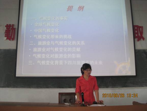 为使旅游系全体师生更加了解当前旅游业的发展趋势,旅游系于2010年6月26日下午2点,在综合楼四楼电教厅举办了一场名为“气候变化与旅游业:风险与机遇”的专题讲座。