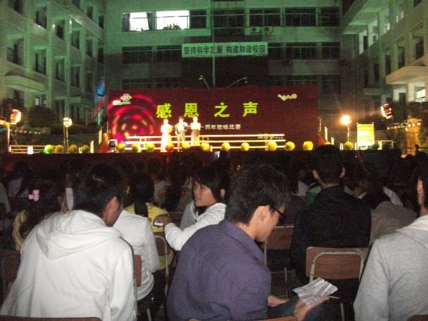 各班的同学依次登场演唱,一首首优美动听的歌曲唱出了同学们对和谐社会的热爱,对祖国的感激,对美好前程的憧憬。