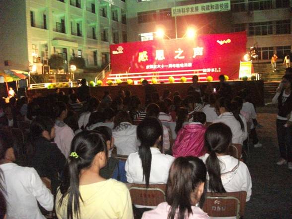 2010年9月28日晚19点旅游系操场上,为了喜迎国庆,唱响和谐,感恩祖国,丰富校园生活,展现全系师生健康向上、和谐共进的精神风貌,旅游系举办了“感恩之声”庆国庆六十一周年歌咏比赛,全系师生跟着音乐一起合唱《歌唱祖国》,由此拉开了比赛帷幕。