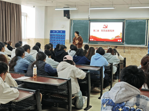 逯春梅老师从端正入党动机到如何书写“申请入党书”,如何确定“入党积极分子以及“发展对象的确定与考察”等根据发展党员25个流程展开详细讲解。大家按组依次坐在位置上聆听党的知识,同学们认真做笔记、认真学习,逯老师与同学们互动频繁,激发出浓厚的学习热情。