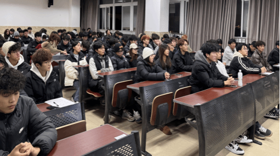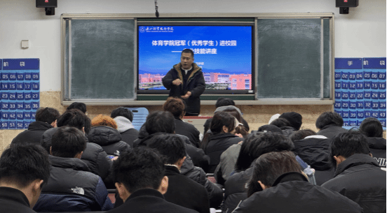 2025年12月14日19点至20:30,体育学院2021届毕业生,全程马拉松、半程马拉松国家级运动健将--向新鹏重返母校,在1B205教室,为校师弟师妹带来了一场题为“从校园跑到专业赛道”的精彩讲座,在刚刚结束的2025年乐山“双遗”马拉松全程比赛中,向新鹏获得亚军。讲座由体育学院副书记刘飞飞主持,全体在校学生及辅导员老师到场聆听,现场气氛热烈,掌声不断。