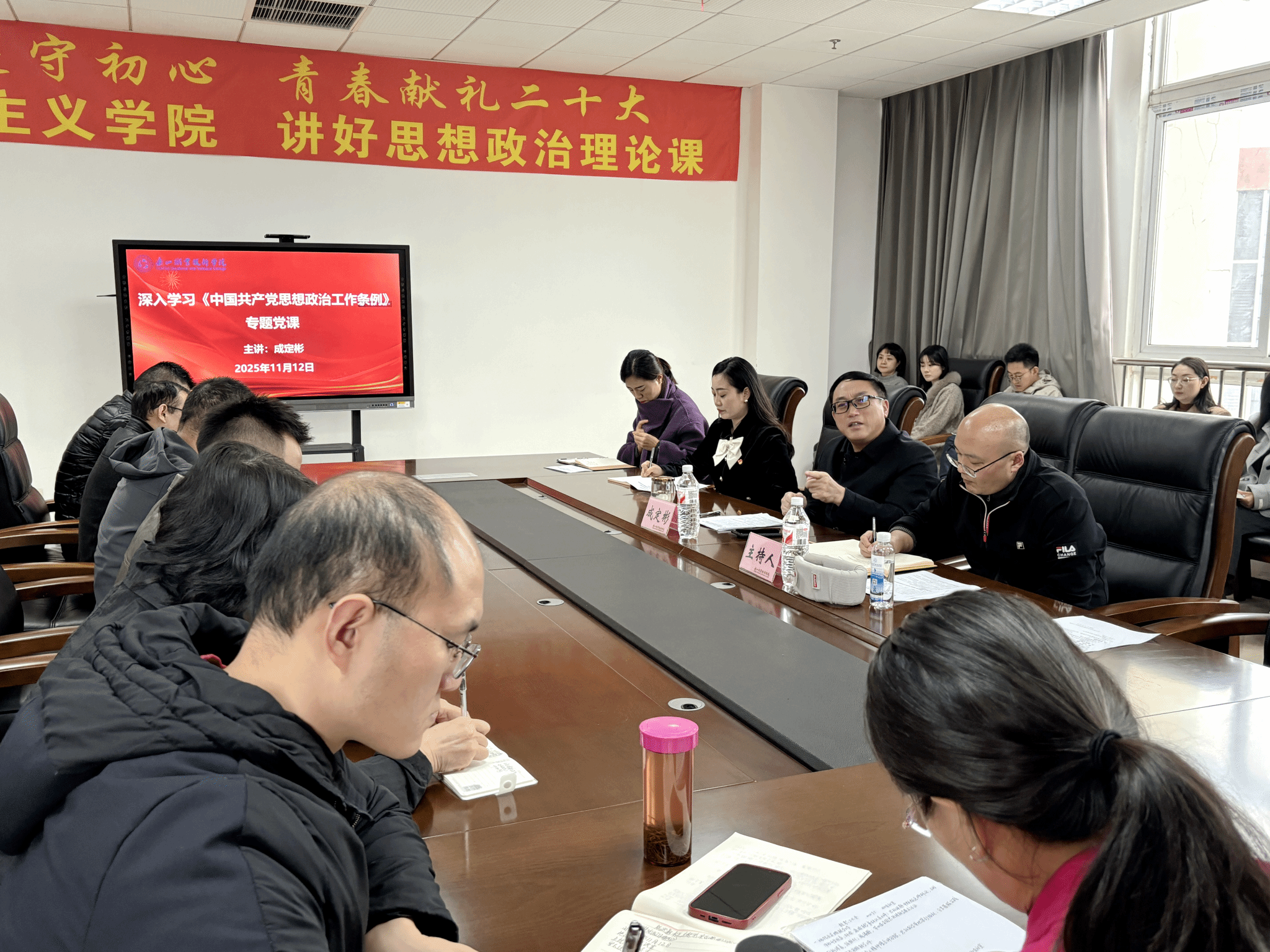 11月12日下午,学校党委书记成定彬走进马克思主义学院,以“深入学习《中国共产党思想政治工作条例》”为主题讲专题党课并主持召开联系师生座谈会。