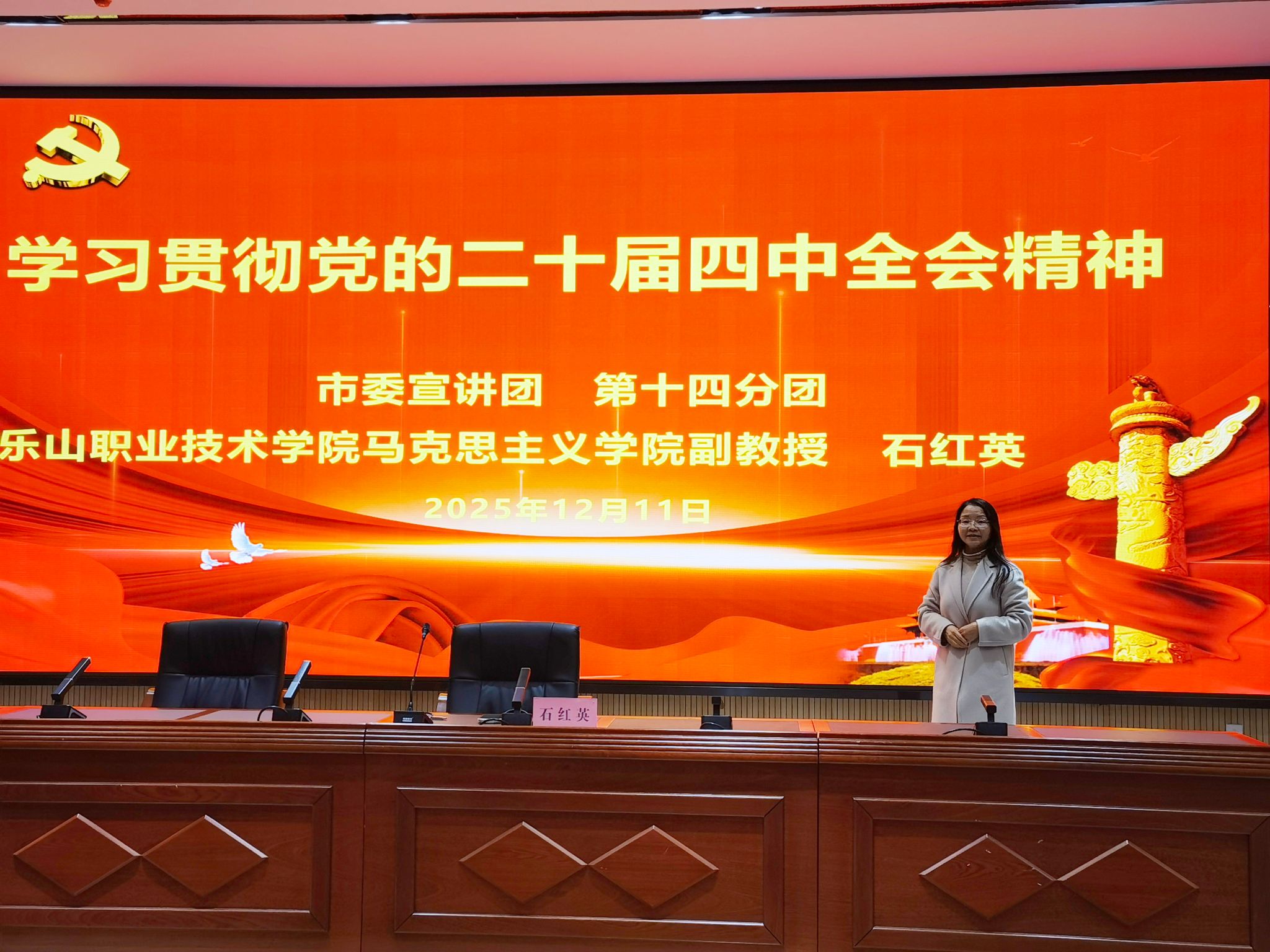 12月11日下午,乐山市第一职业中学在学校学术报告厅举行“学习贯彻党的二十届四中全会精神”专题讲座。市委宣讲团成员、sunbet申搏官方网站马克思主义学院石红英副教授应邀为学校近200名师生代表作专题辅导报告。