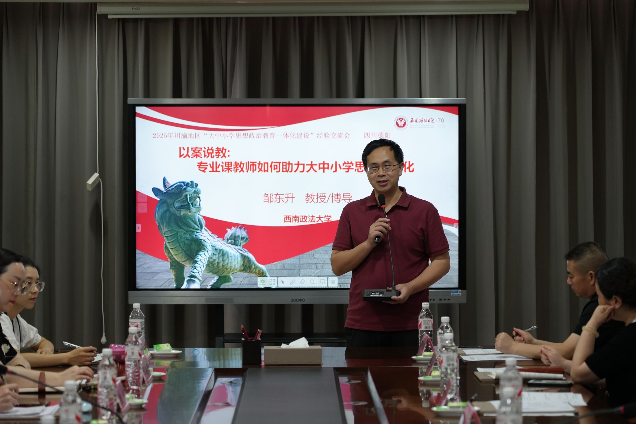 随后,邹东升教授以“以案说教:专业课教师如何助力大中小学思政一体化”为主题作了专题讲座。他以问题链方式深入剖析多层治理中的“三个共同体”及其价值引领,以歌曲《爱我中华》和“石榴籽与石榴的关系”为例,剖析其共同性与差异性,强调铸牢中华民族共同体意识对于国家治理层面的重要性,并从“故事叙事-理性分析-理论深化”三个维度解析了学段特色区分与教学教育衔接的重要性和方式方法。
