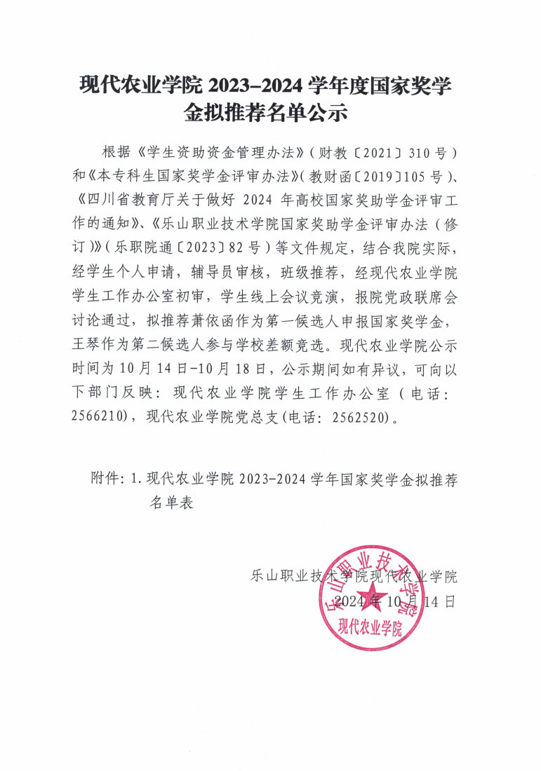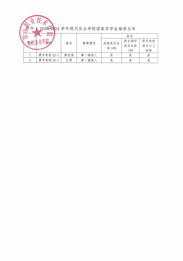 现代农业学院2023-2024学年度国家奖学金拟推荐名单公示