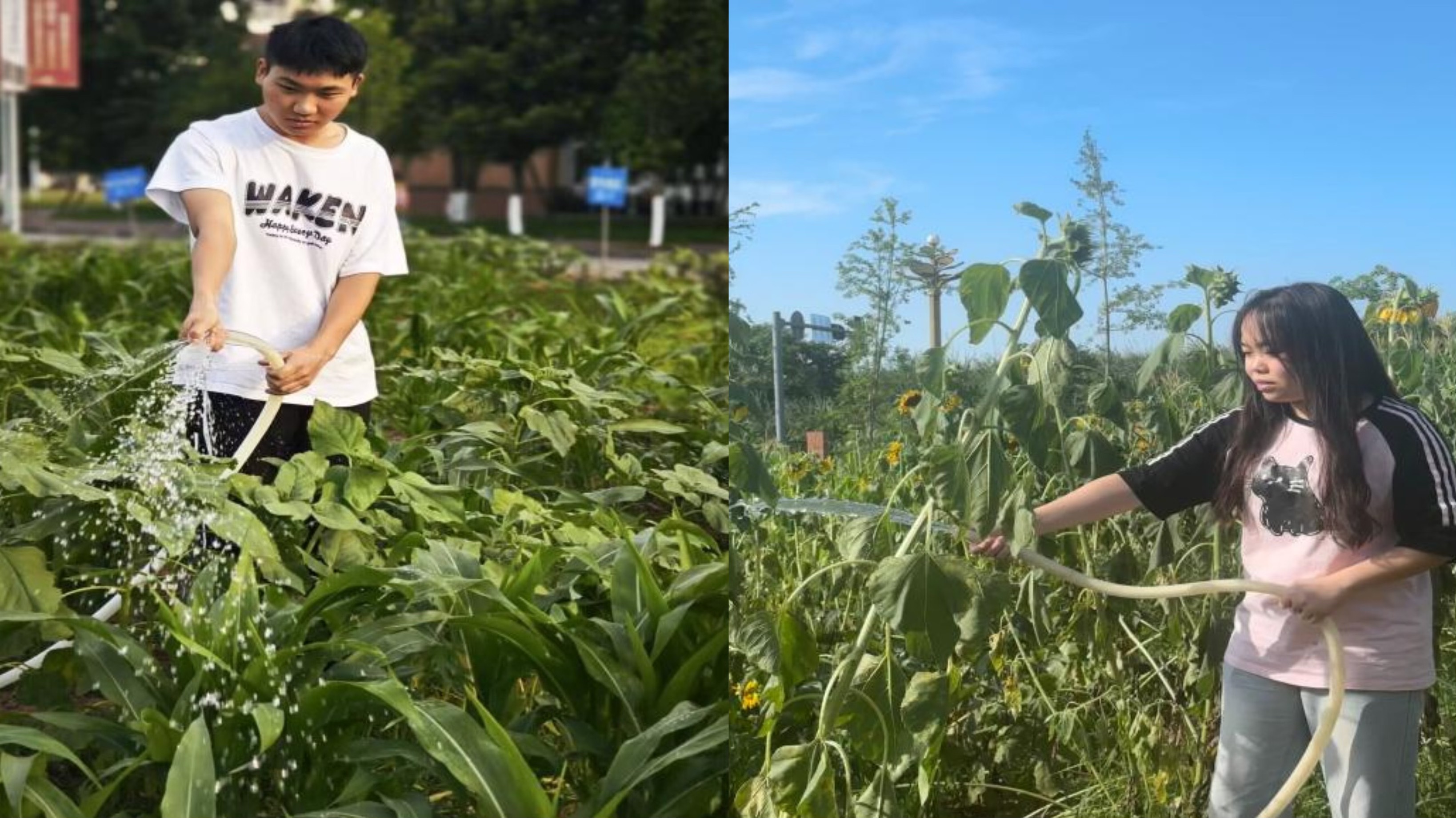 活动过程中,同学们前往4号劳动实践基地,对自己亲手种下的农作物进行浇水灌溉和除草施肥。在劳动的同时,体会作物逐渐成长成熟的喜悦。活动以植物、园艺及人与植物的亲密关系为推力,结合精神投入、希望、期待、收获与享受的过程,人与植物间亲密的接触和互动,有助于促进学生心理健康。