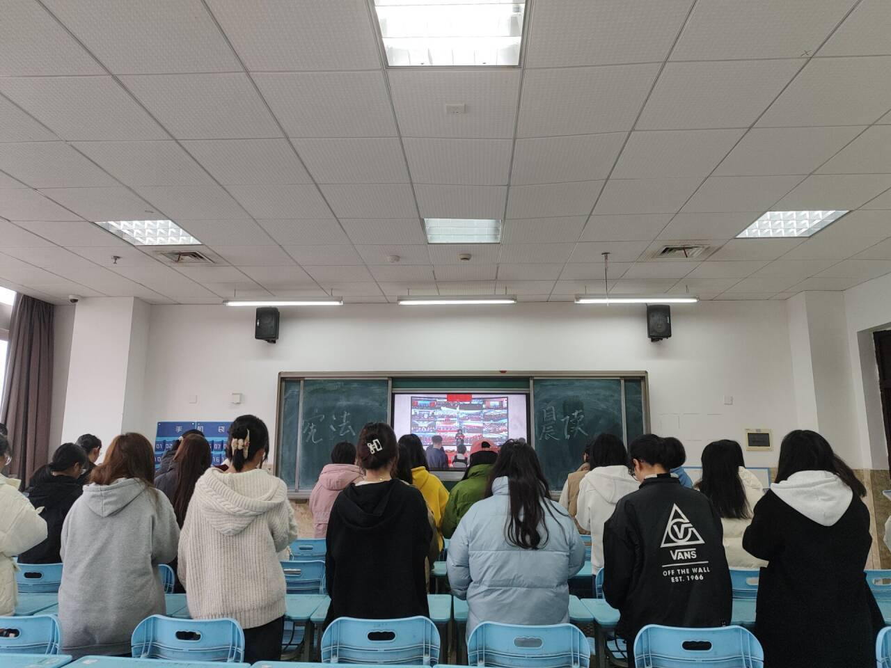 2023年12月4日,现代农业学院组织全院学生通过教育部全国青少年普法网收看网络直播。12月5日-10日早上8:10分,开展“宪法晨读”环节,由现代农业学院团委书记汤秀娟领读宪法部分条款,现场学生及全体人员跟读,晨读环节完成后进入《宪法伴我们成长》歌曲传唱环节,学生代表带领全体学生齐唱歌曲,营造了良好的学习氛围。