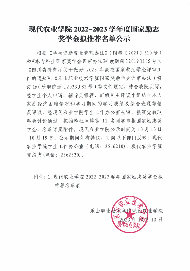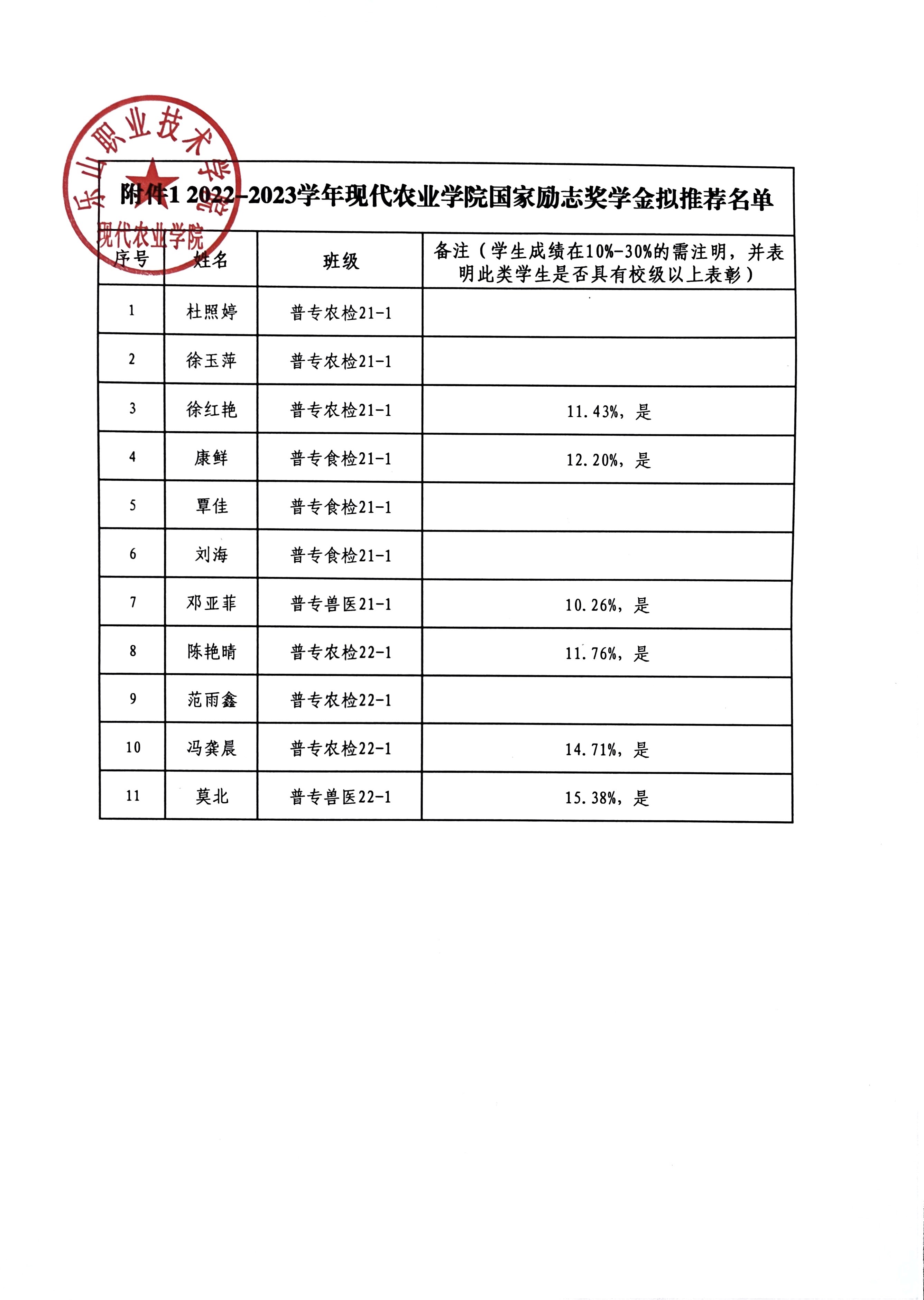 现代农业学院2022-2023学年度国家励志奖学金拟推荐名单公示