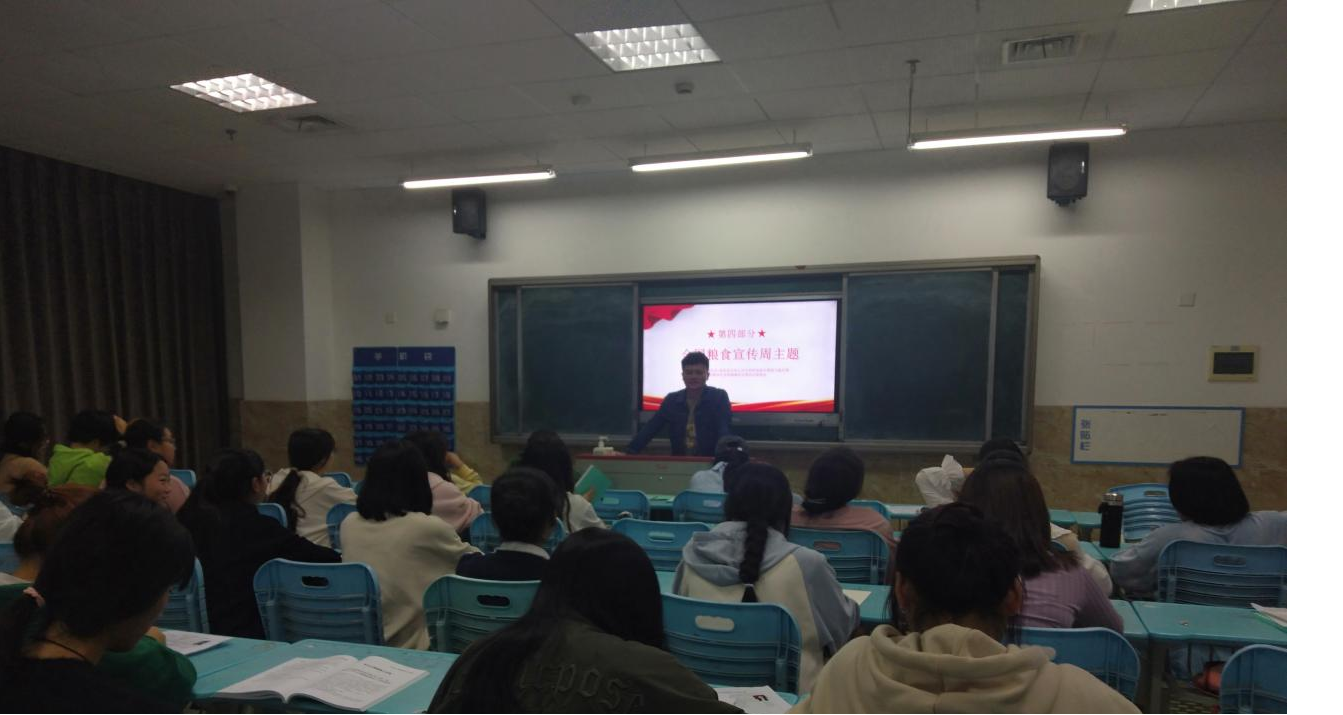 各班辅导员从世界粮食的安全概念、世界粮食日的由来和主题内涵及全国粮食安全宣传周主题等方面向同学们宣讲了粮食安全知识,并通过相关视频播放学习,使同学们更加深入了解“践行大食物观,保障粮食安全”,深刻理解“端稳中国饭碗”。