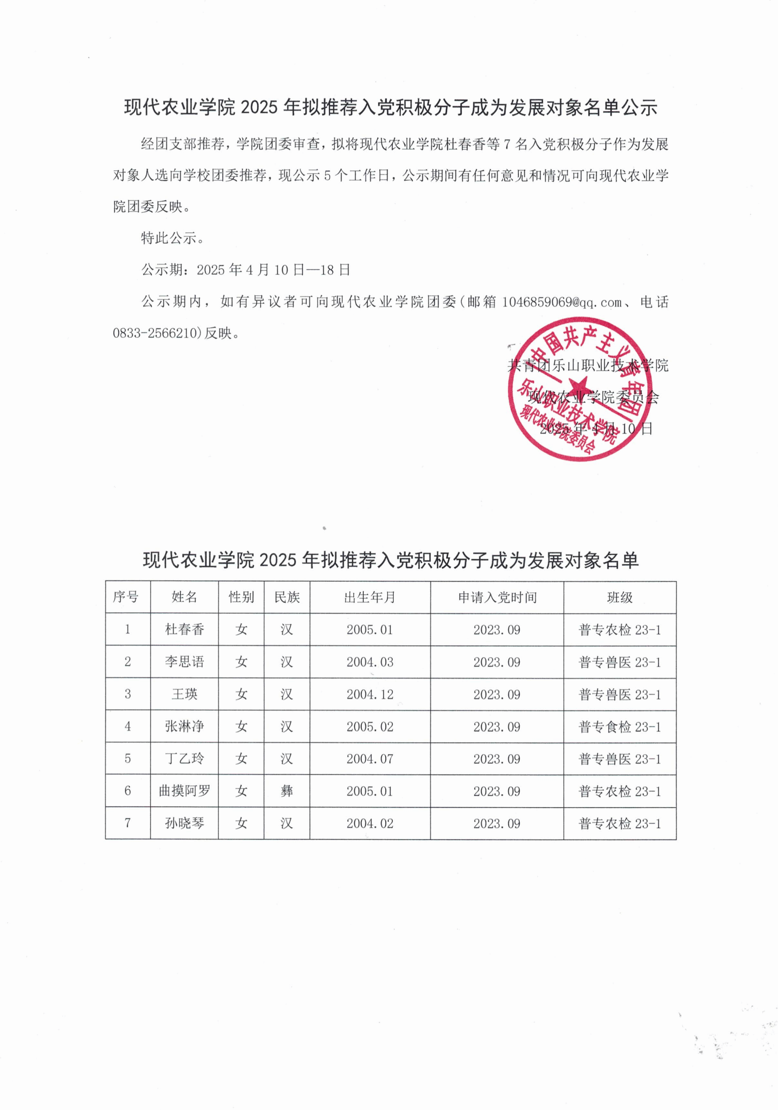 现代农业学院2025年拟推荐入党积极分子成为发展对象名单公示