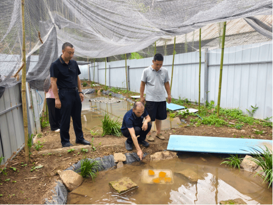 在峨眉山市高桥镇两河村,唐勇博士现场指导熊丽琼家庭农场石蛙养殖,对石蛙养殖场地建设、防逃防鸟措施给出了专业的建议。重点指导石蛙蝌蚪养殖时期个体大小生长不均的问题,现场诊断蝌蚪营养不足,建议使用全价配合饲料,减少变态期因微量元素不足和维生素不足引起的病变,促进蝌蚪尽快转变为成体。鼓励他们合理搭设料台,使用配合饲料饲喂成蛙,提高生长速度,缩短养殖周期,确保养殖成功。
