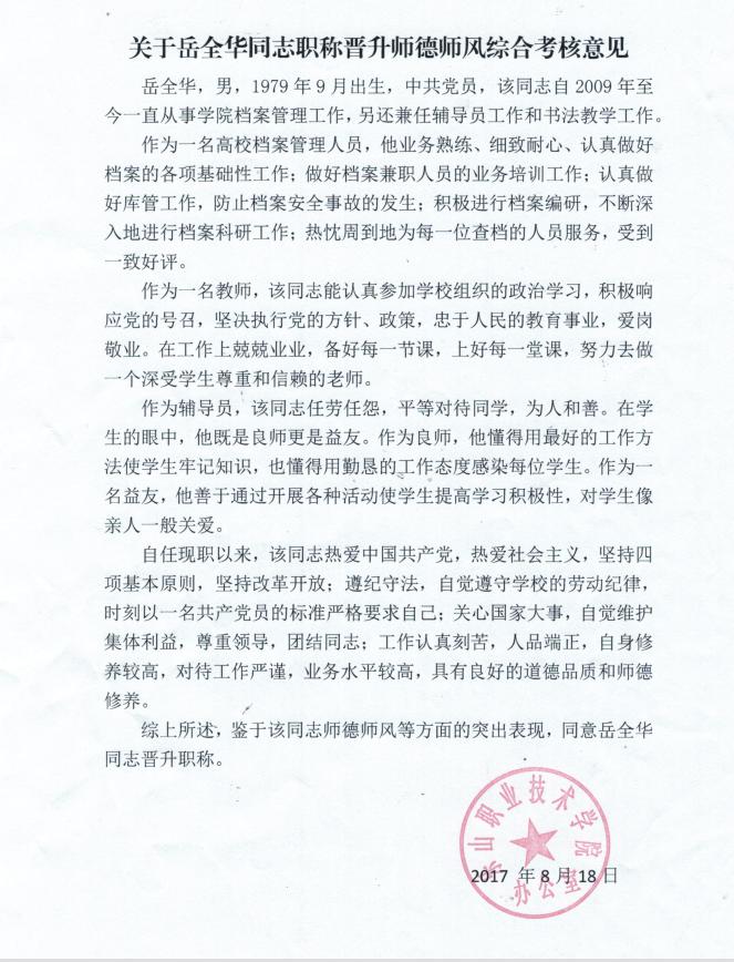 根据今年职称工作安排,结合学院岗位空岗数及资格审核情况,拟推荐岳全华同志申报档案专业副研究馆员职务。