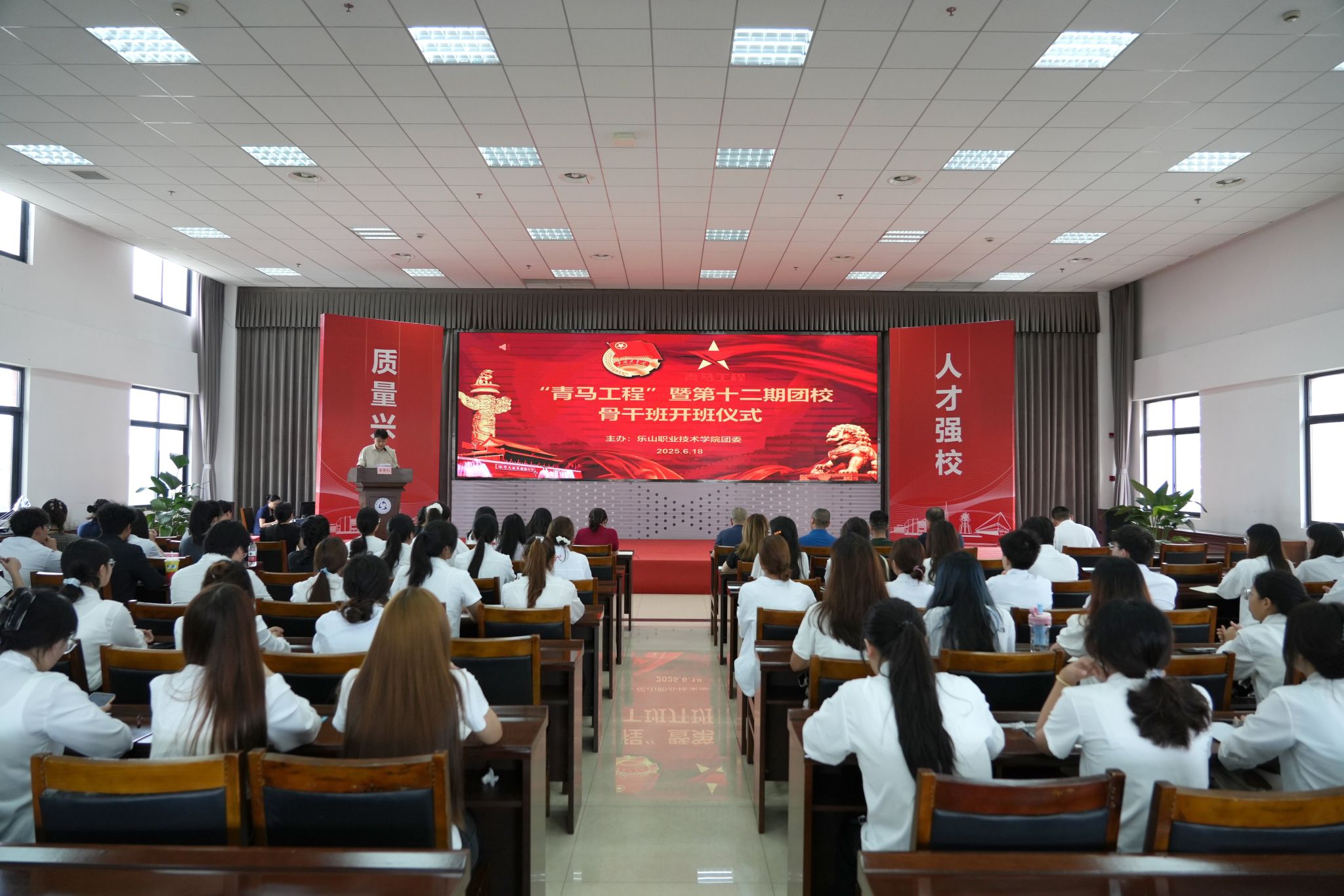 庄严的国歌声拉开仪式序幕。在宣读纪律规定、新学员代表发言后,全体学员重温入团誓词,铿锵誓言彰显青春信仰。张学河副校长在讲话中代表学院党委行政对培训班的开班表示热烈祝贺,并深刻阐述了实施“青马工程”的战略意义。他强调,本期培训旨在锻造政治过硬、信仰坚定、心系人民、勇于担当的青年先锋力量,是确保党的事业薪火相传的重要举措。随后,张学河副校长为培训班庄严授旗,象征使命与责任的传递。激昂的团歌声中,开班仪式圆满结束。