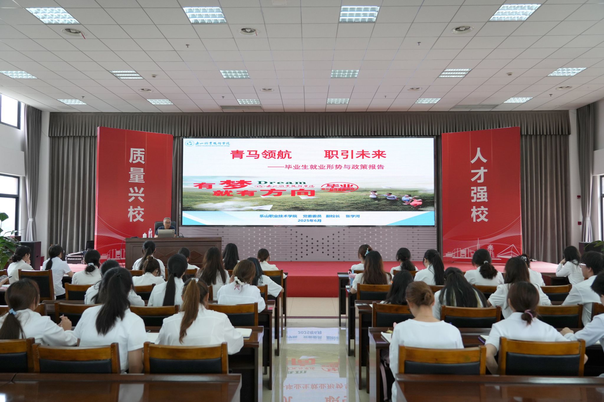 仪式后,张学河副校长以《青马领航,职引未来》为题讲授开班第一课。课程紧扣青年成长与时代需求,深入剖析当前就业形势,解读国家就业政策,引导学员树立正确就业观、掌握实用技巧,并分享朋辈榜样力量,为学员成长为“模范表率、堪当重任”的青年政治骨干夯实实践基础。