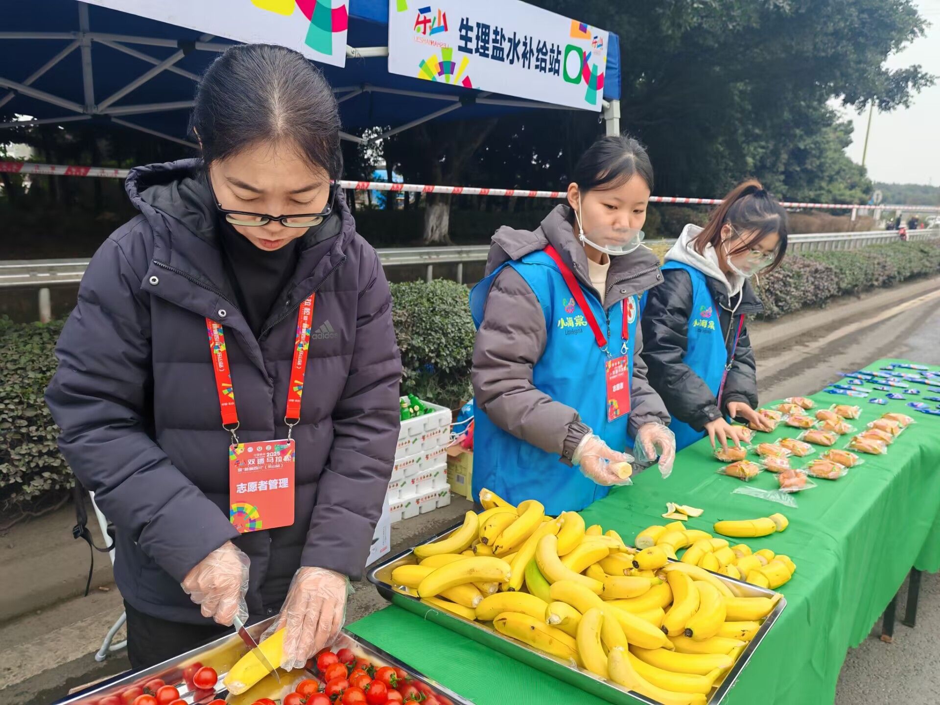 14日凌晨4时,当嘉州大地仍在沉睡,sunbet申搏官方网站的校园内已灯火通明。673名志愿者准时集结,在校团委张瑞琪、郭胜男、初丽媛、李一和刘俊波老师的统筹下分乘10辆大巴赶赴各服务点位,清晨5时前全部到岗就绪。比赛期间,申搏官网志愿者们的身影遍布42.195公里的全程赛道与21.0975公里的半程赛道。在青衣江一桥补给站,医学专业的志愿者们分工协作,将饮用水和功能饮料提前倒好分装,确保跑者无需减速即可便捷取用;在长青路折返点,护理专业学生组成的医疗辅助团队密切观察选手状态,为体力不支者提供降温擦汗、肌肉放松等服务,累计协助处理轻微抽筋、擦伤等情况43起。来自护理学院的志愿者游志兰惠表示:“课堂上学习的急救知识此刻派上了大用场,能为跑者的安全保驾护航,再冷再累都值得。