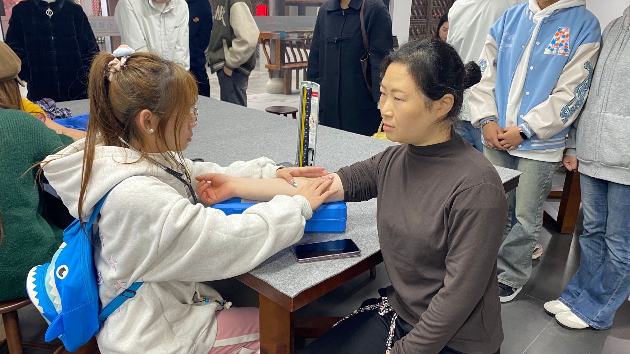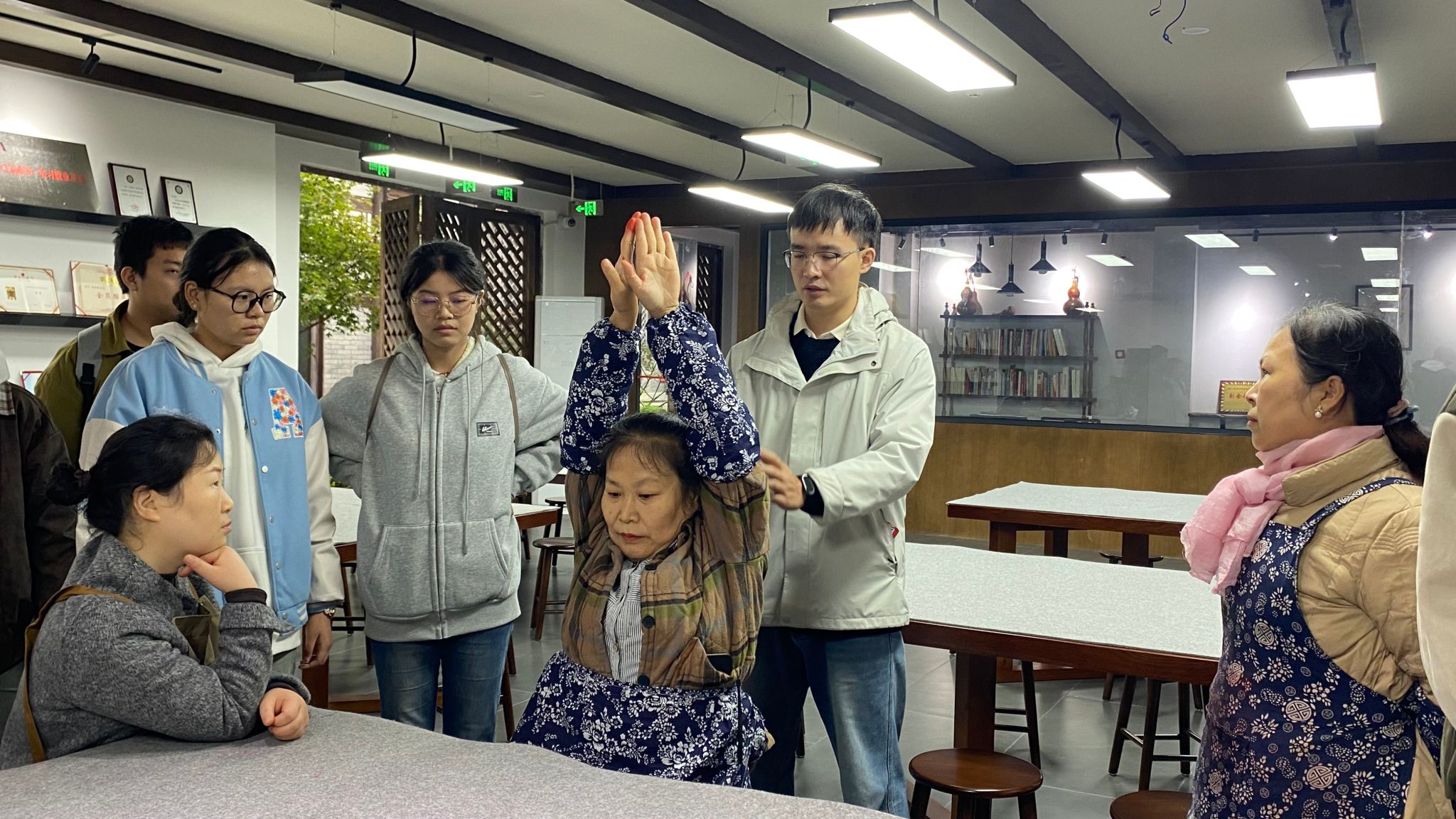 本次研学交流的价值并未止步于文化认知的深化。在沉浸式感受非遗魅力的同时,护理康养学院的师生们更怀着感恩之心,主动以专业所长回馈文化守护者。