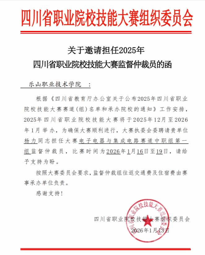 1月16日至19日,2025年四川省职业院校技能大赛“电子电器与集成电路”赛项(中职一组)在宜宾市南溪职业技术学校举行。申搏官网教师杨力受大赛组委会委派,赴宜宾担任该赛项监督仲裁员。