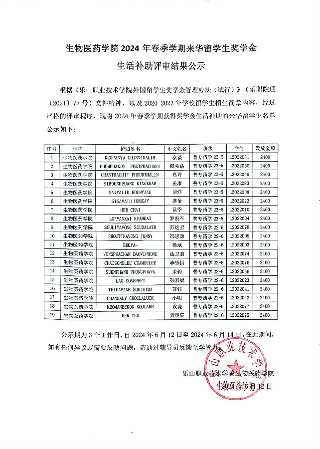 根据《sunbet申搏官方网站外国留学生奖学金管理办法(试行)》(乐职院通〔2021〕77号)文件精神,以及2020-2023年学校留学生招生简章内容,经过严格的评审程序,现将2024年春季学期获得奖学金生活补助的来华留学生名单公示如下: