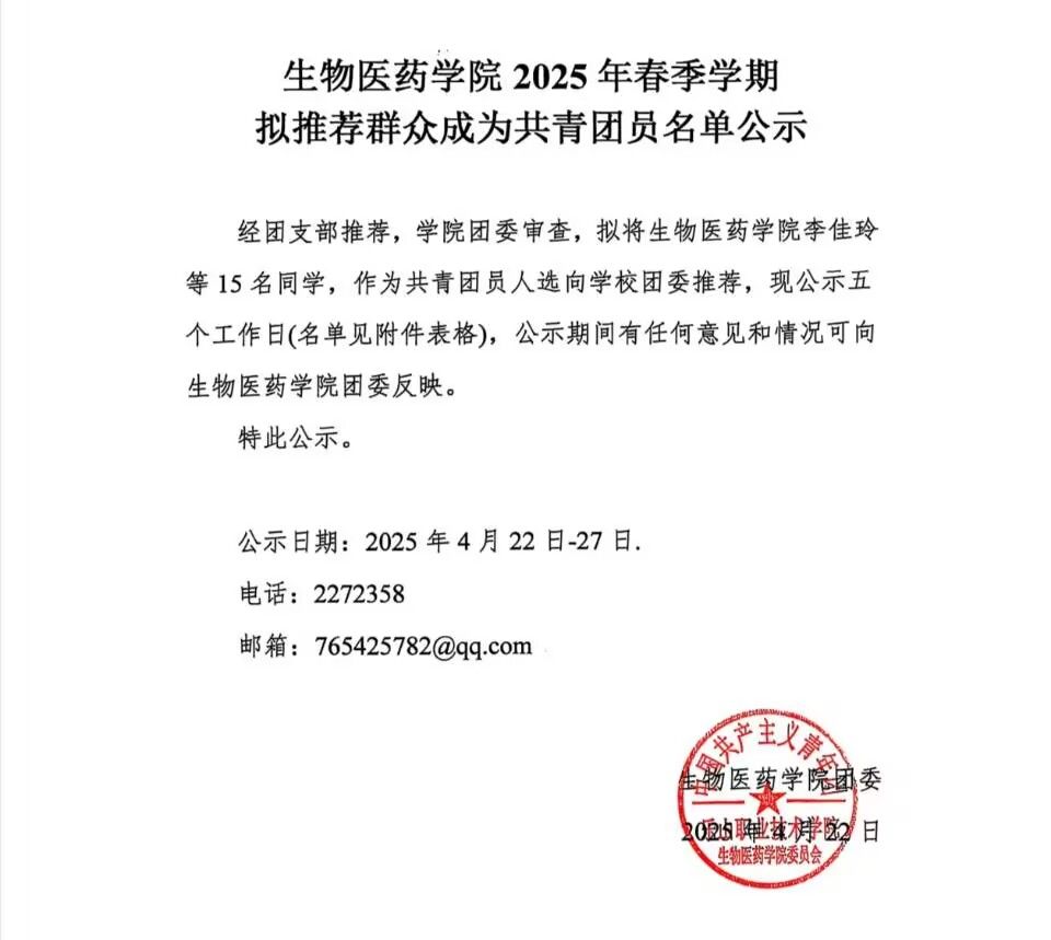 生物医药学院2025年春季学期 拟推荐群众成为共青团员名单公示
