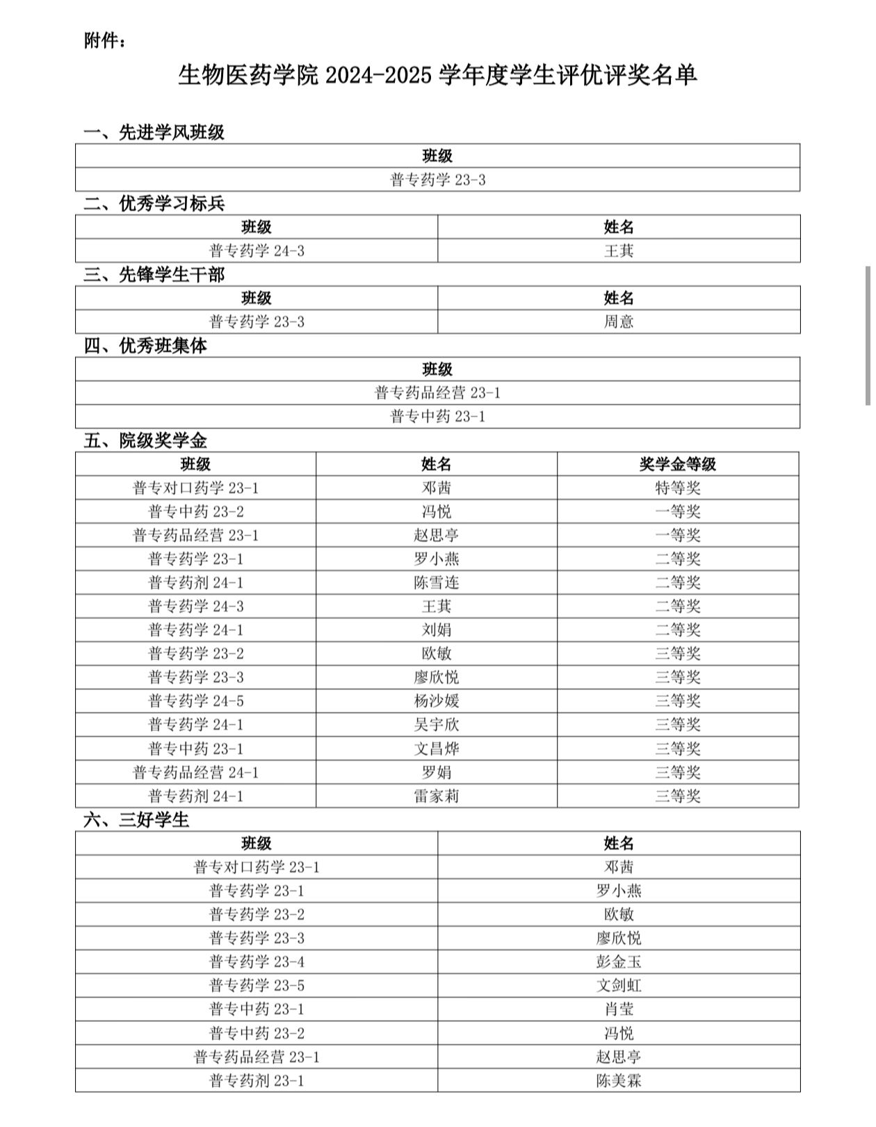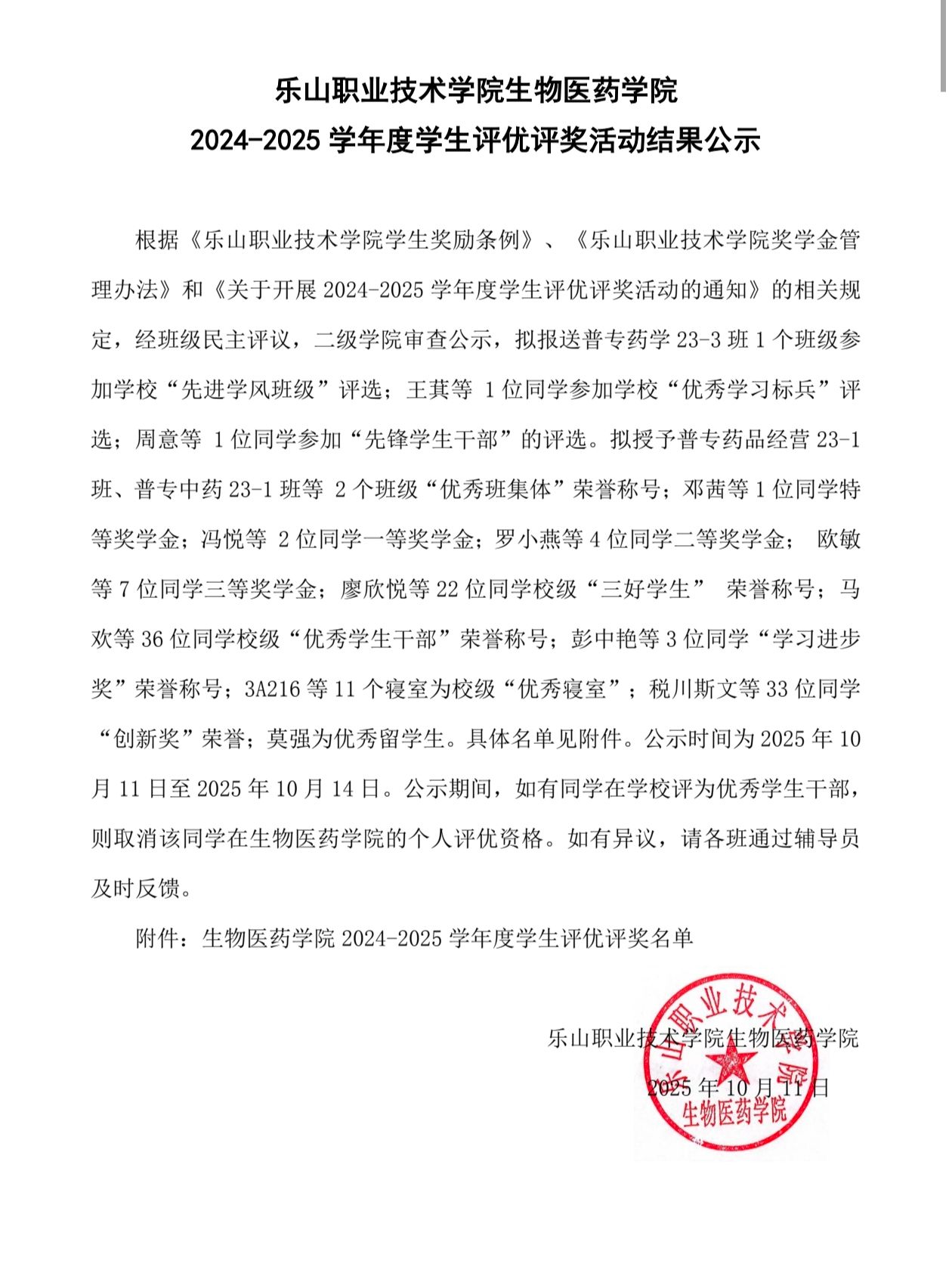 sunbet申搏官方网站生物医药学院 2024-2025 学年度学生评优评奖活动结果公示
