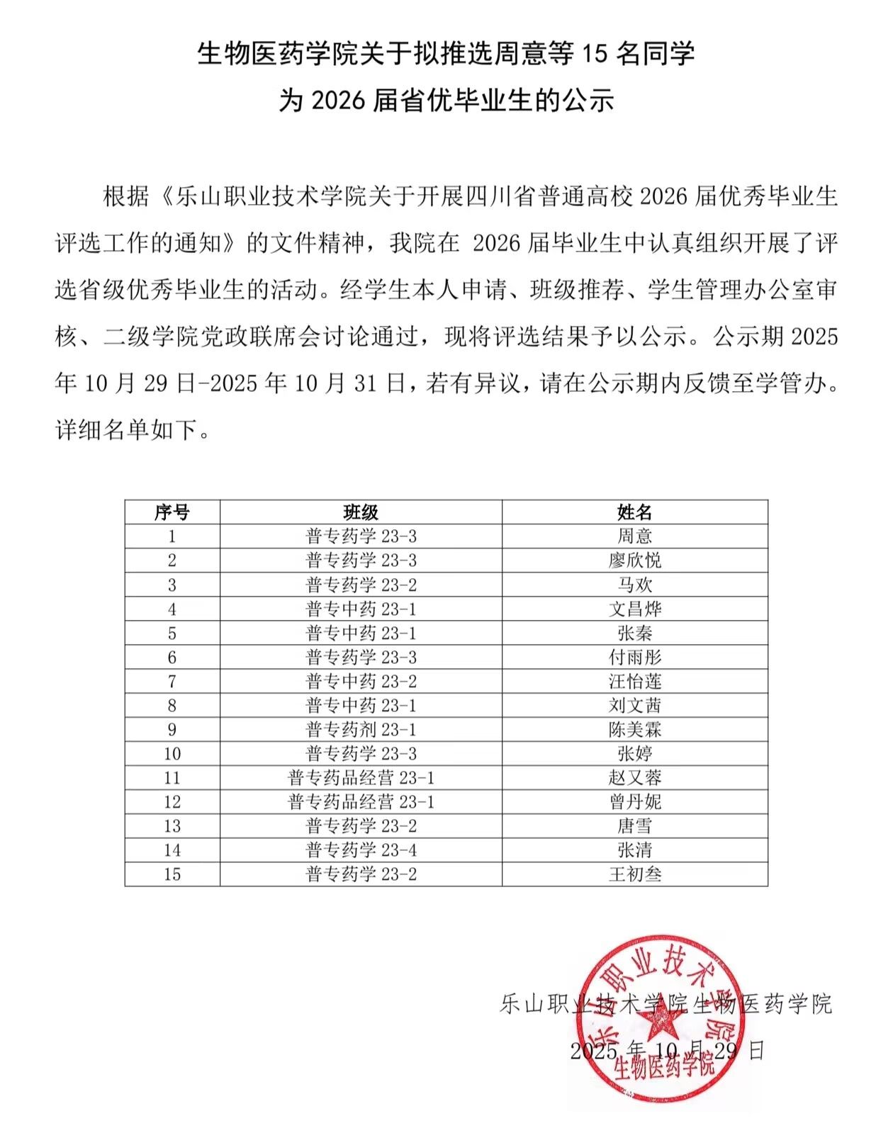 生物医药学院关于拟推选周意等15名同学为2026 届省优毕业生的公示